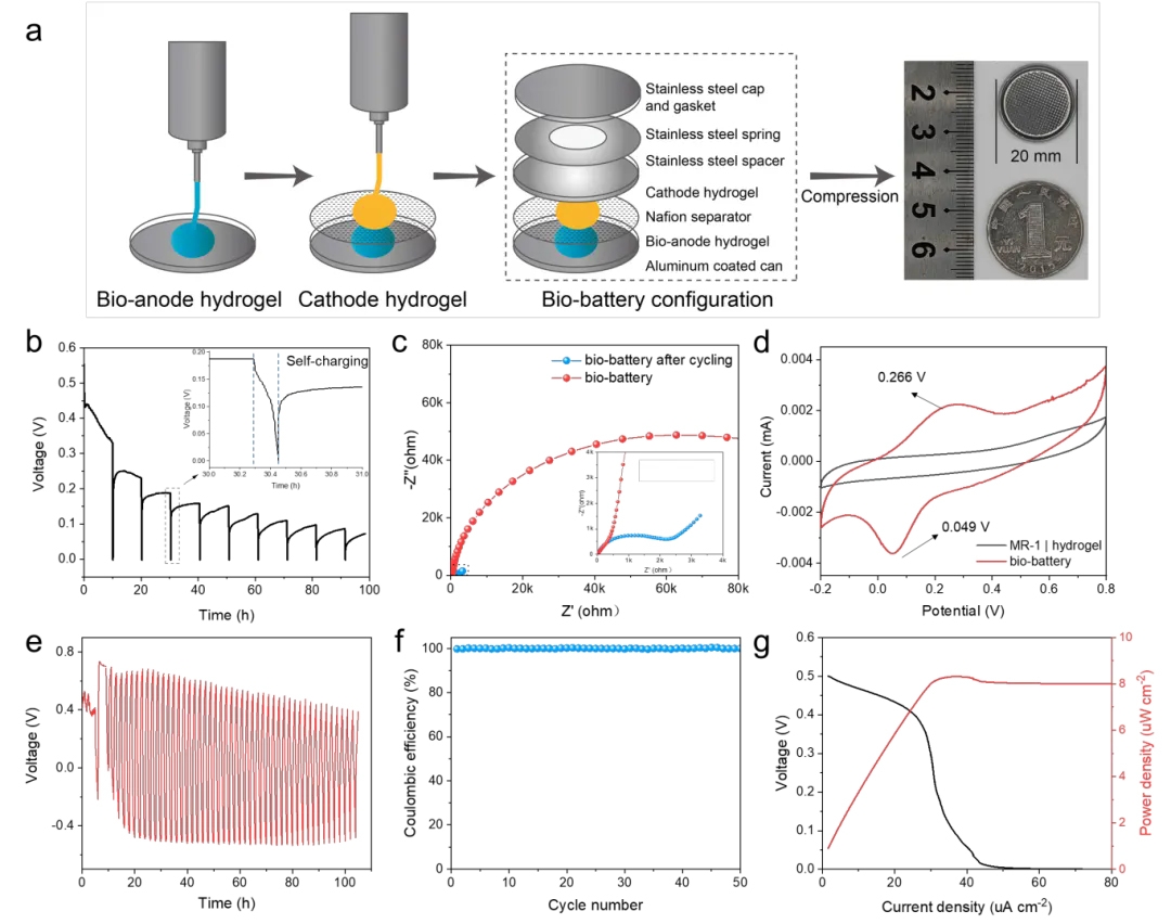 受锂离子电池制造技术启发,研究人员利用活体水凝胶作为生物阳级墨水,含有K₃[Fe(CN)₆]的海藻酸盐水凝胶作为阴极墨水,Nafion膜作为离子交换膜,制备出直径20毫米、高度3.2毫米的微型生物电池(图4)。该电池的发电源于水凝胶内细菌的代谢活动,在细菌生长10小时后,生物电池能够达到450毫伏的电压。该生物电池可以进行自充电,实现长达10次的自充电-放电循环。在整个循环中,细菌维持了超过70%的高存活率,在循环结束时存活率更是高达97%,这充分证明细菌在电池内部仍然保持着生长和代谢活动。生物电池的电压随着阴极中K₃[Fe(CN)₆]浓度的增加而升高。同样,细菌在连续运行100小时后,也保持了超过90%的高存活率。