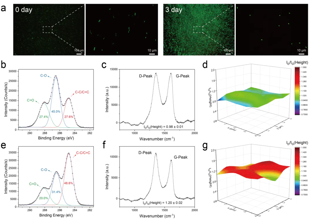 活/死检测结果展示,细菌在水凝胶中仍然可以保持活性,并可将氧化石墨烯(GO)还原为还原氧化石墨烯(rGO)(图3)。具体来看,C1s XPS光谱显示,与GO对照样品相比,MR-1 rGO样品中C-C/C=C键的百分比显著增加(从27.6%增加到48.6%),而C-O/C=O键的百分比相应减少(从72.4%减少到51.5%),这表明含氧C键显著减少。拉曼光谱中D峰和G峰的强度比(ID/IG)与sp2共轭区域成反比,该比值从0.98增加到1.2,为GO的成功还原提供了有力证据;并且,强度比(ID/IG)在约3天时达到平台期,这意味着水凝胶中的GO已完全还原。此外,水凝胶中的GO对S. oneidensis MR-1的生长没有显著影响,在浓度范围为0.5 mg/mL至5 mg/mL的GO条件下,均未观察到抑菌圈的形成。在整个培养过程中,细菌的存活率保持在80%以上,充分表明其代谢活性得以保存。拉曼成像图案显示出GO还原在水凝胶中的均一性。