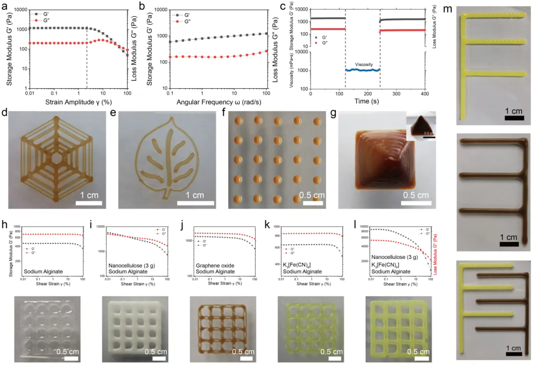 希瓦氏菌生物被膜的储能模量(G´)大于损耗模量(G´´),呈现出弹性固体状水凝胶的特性,使其能够进行3D打印(图2)。研究人员成功打印出多种定制形状和几何图形,涵盖一维到三维,如蜘蛛网、大面积网、叶子、点阵列,甚至一个1厘米高的三维金字塔。3D环境为生物体系的功能发挥提供了良好的场所,研究进一步将其封装在藻酸盐水凝胶中,确保细菌细胞在生物装置制造和后续使用过程中的活力。10%的藻酸盐水凝胶表现出粘性液体状特性,其损耗模量(G´´)高于储能模量(G´)。为了增加粘度,研究人员在水凝胶中添加了纳米纤维素,当纳米纤维素含量从10%增加到30%时,水凝胶转变为弹性固体胶。考虑到生物能源装置的制备,研究人员进而在水凝胶中引入了0.05%的氧化石墨烯,不仅增强了导电性,同时还提升了粘弹性。包含希瓦氏菌的活体水凝胶可以作为阳极材料,另外将K₃[Fe(CN)₆]封装在藻酸盐水凝胶中可以作为阴极材料。为了展示生物能源装置的潜力,将阳极生物墨水和阴极墨水装入单独的墨盒中,可打印出叉指电极,展示了定制化和自动化制造的潜力。