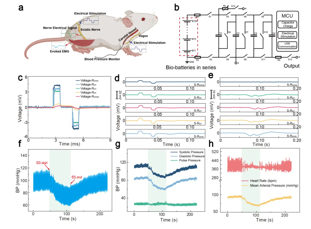 本项目进一步探究了生物电池在神经刺激方面的应用(图5),以期在疾病治疗领域发挥重要作用。研究人员通过添加电容器,实现了生物电池电能的可控收集和释放,进而能够精准控制刺激的输出电压和电流。在刺激坐骨神经并监测其神经信号和肌电信号的实验中,研究人员发现,随着刺激强度的增加,诱发的神经动作电位和肌内肌电信号的幅度逐渐增大。这种诱发电位的获取在电刺激干预和促进生物体的恢复和治疗方面具有重要应用价值。此外,研究人员将可控电刺激电路的输出端通过电极连接到大鼠的迷走神经上,成功实现了对大鼠血压的调节。在刺激前,大鼠的血压保持在基线水平;对迷走神经施加电刺激后,大鼠血压表现出统计学上显著的降低(p<0.01)。这种干预方法与现有的超声干预等物理治疗方法具有相似的效果。停止刺激后,大鼠的血压由于其内在血压调节机制逐渐呈现上升趋势,接近基线水平。在刺激期间,收缩压、舒张压、脉压、心率和平均动脉压与刺激前水平相比,均出现了显著降低(p<0.01),这主要源于迷走神经对心血管功能的抑制作用。