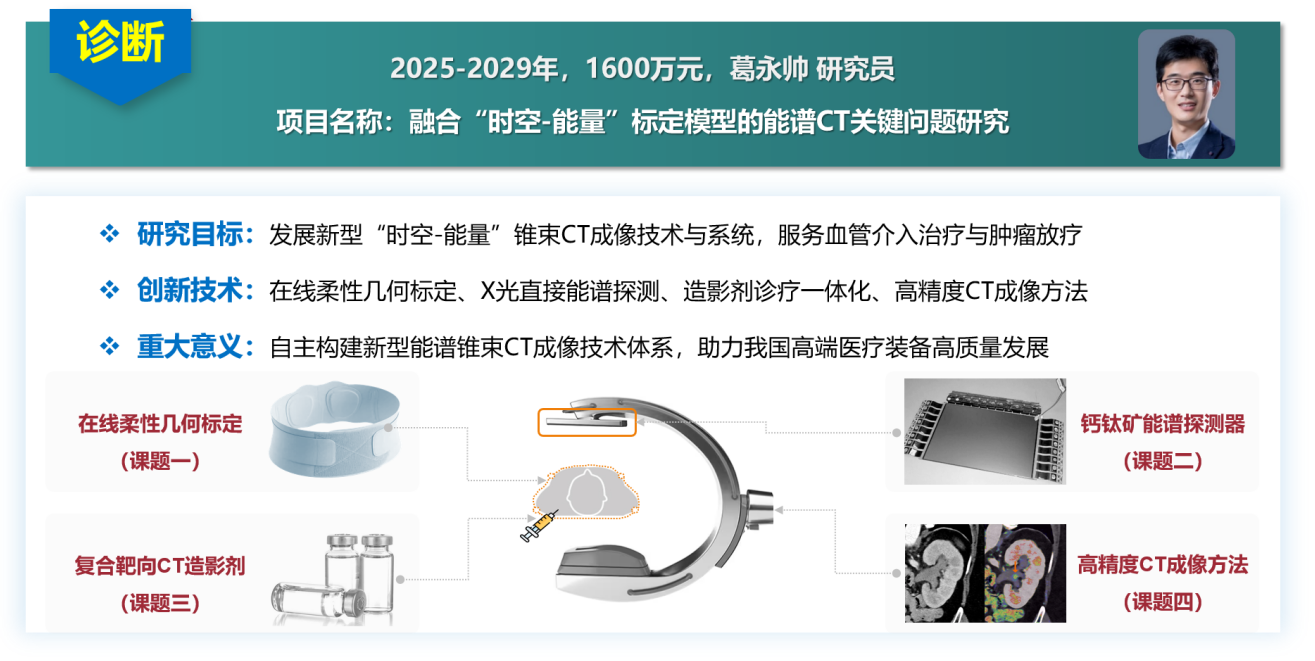 近日,国家科技管理信息系统公布多个国家重点研发计划重点专项2024年度立项结果。葛永帅研究员牵头获批科技部“工程科学与综合交叉专项”重点研发计划专项项目,项目总经费为3200万元。 此项目拟研发新型“时空-能量”锥束CT 成像综合解决方案。通过建立“时空-能量”锥束CT 成像数学模型,为系统几何标定、能谱信息探测、数据采集与图像重建等提供统一的理论指导;接着,发展个性化、大视野柔性在线几何标定模型,为复杂场景实时高精度CT 成像提供保证;其次,研发新型基于钙钛矿半导体材料的直接转化能谱探测器,为高分辨能谱信息探测提供核心器件;然后,研发复合靶向CT 造影剂,为肿瘤一体化精准诊疗提供特异性新药;最后,研发新型数据采集与处理技术、CT 图像智能重建算法,为获得高精度”时空-能量”锥束CT 图像提供新方法。