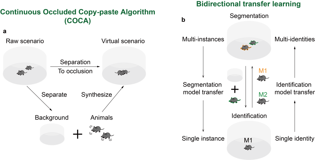 SBeA的姿态估计小样本数据生成算法和身份识别零样本双向迁移学习方法的设计均受到大脑的工作机制的启发(图1)。人类在识别交互的动物时,能 “脑补”动物可能存在的遮挡关系,这一过程为大脑提供大量的新数据。据此所提出的连续遮挡复制粘贴数据算法可以有效合成大量新数据(图1a),能够训练精度更高的模型,获得更加准确的3D社交姿态估计结果。在非社交场景中,人类能够通过外表区分每一只动物的身份,也能“脑补”到多动物社交场景,识别每一只动物的身份。受到启发,SBeA的多动物社交身份识别通过共享不同网络的知识实现双向迁移学习(图1b),借助模型之间的“脑补”,消除了标注数据的过程,并实现了高精度的外表相似动物的身份识别。