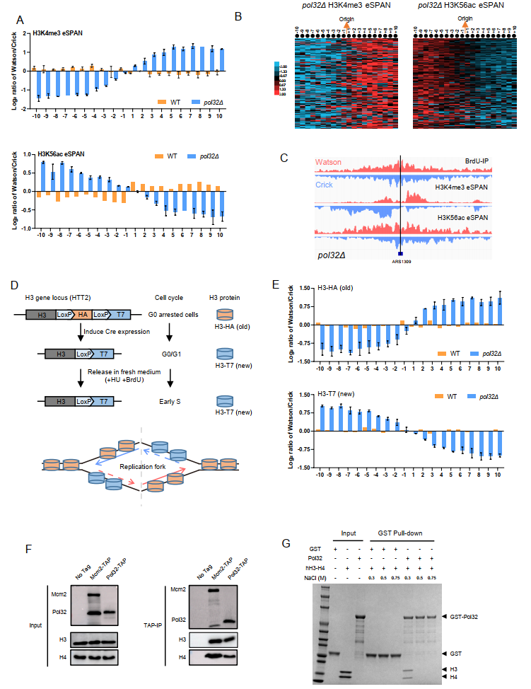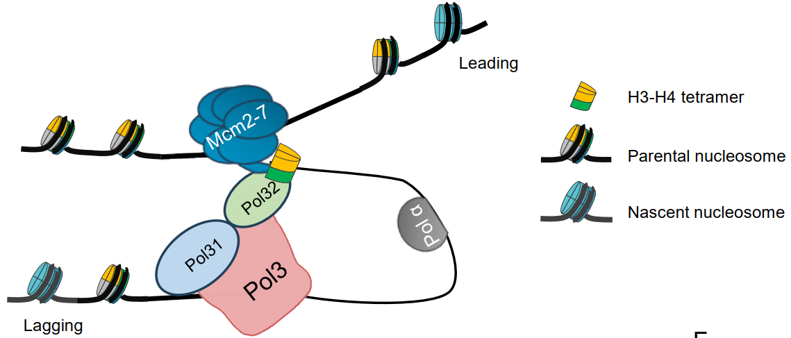 图2. Pol32 介导亲组蛋白H3-H4传递到滞后链