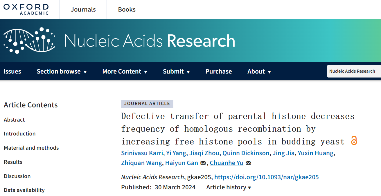 在前不久的3月8日,同样由甘海云研究员课题组及美国明尼苏达大学Hormel研究所的于传贺教授在NAR(Nucleic Acids Research)发表题为“亲代组蛋白传递缺陷通过增加游离组蛋白的浓度来降低同源重组的频率(Defective transfer of parental histone decreases frequency of homologous recombination by increasing free histone pools in budding yeast)”的文章,该研究明确了亲代组蛋白H3-H4四聚体传递遭到破坏时产生的遗传和表观遗传结果。这一发现揭示了DNA复制过程中亲代组蛋白正确传递不仅对维持染色质结构的稳定性至关重要,而且任何由于亲代组蛋白传递缺陷导致的同源重组活性降低都可能对细胞健康产生不利影响。