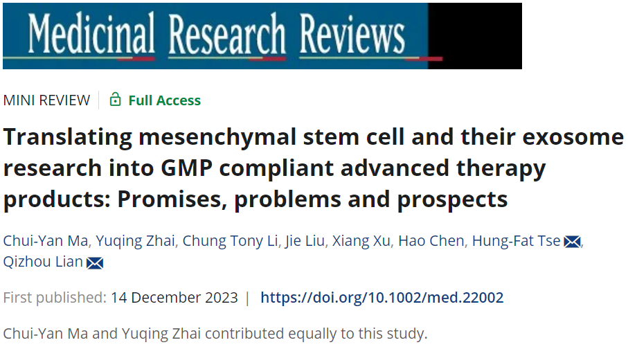 近日,深圳理工大学(筹)合成生物学院、中国科学院深圳先进技术研究院合成生物学研究所连祺周教授团队和香港大学谢鸿发教授团队在国际科学期刊《Medicinal Research Reviews》发表了题为《Translating mesenchymal stem cell and their exosome research into GMP compliant advanced therapy products: Promises, problems and prospects》的综述论文。