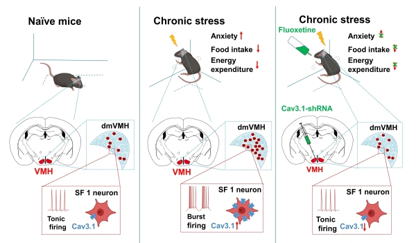 通过研究,团队首先发现了慢性压力应激小鼠出现焦虑样行为和代谢平衡异常(摄食减少,能量消耗降低),其VMH核团中簇状放电神经元的比例和强度也会显著上升。利用光遗传技术调控VMH神经元可以诱发簇状放电和VMH钙活动增强;而持续诱发的簇状放电则能够模拟慢性压力应激类似的焦虑样行为以及代谢变化。