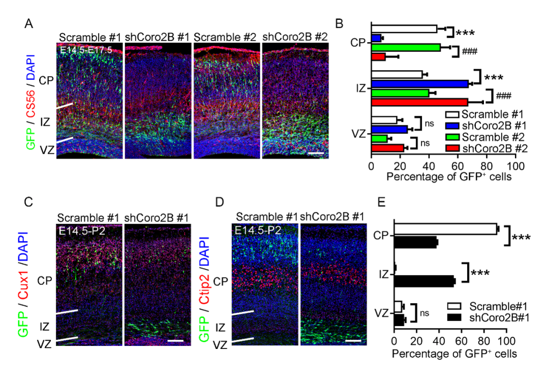 图1 | 敲减coronin 2B导致小鼠皮层神经元迁移障碍