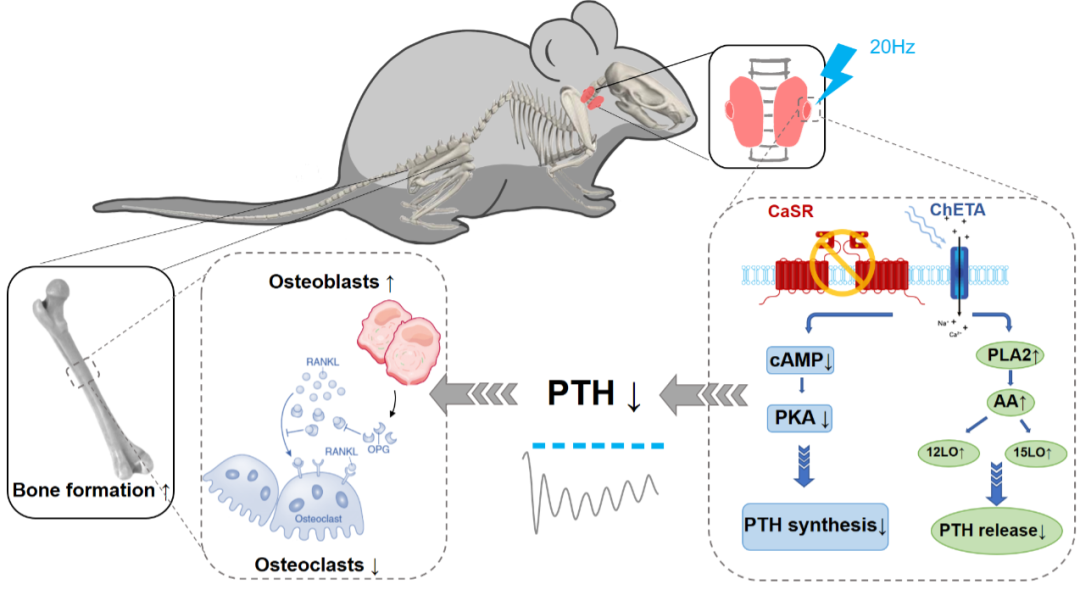 研究团队历时5年,创新性地将光遗传技术运用于甲状旁腺素(Parathyroid Hormone, PTH)的分泌调控,通过精准节律性调节PTH分泌,干预继发性甲旁亢引发的骨丢失。该研究拓展了光遗传技术在骨与内分泌研究领域的应用,并为推进光遗传技术的临床转化提供科学依据。