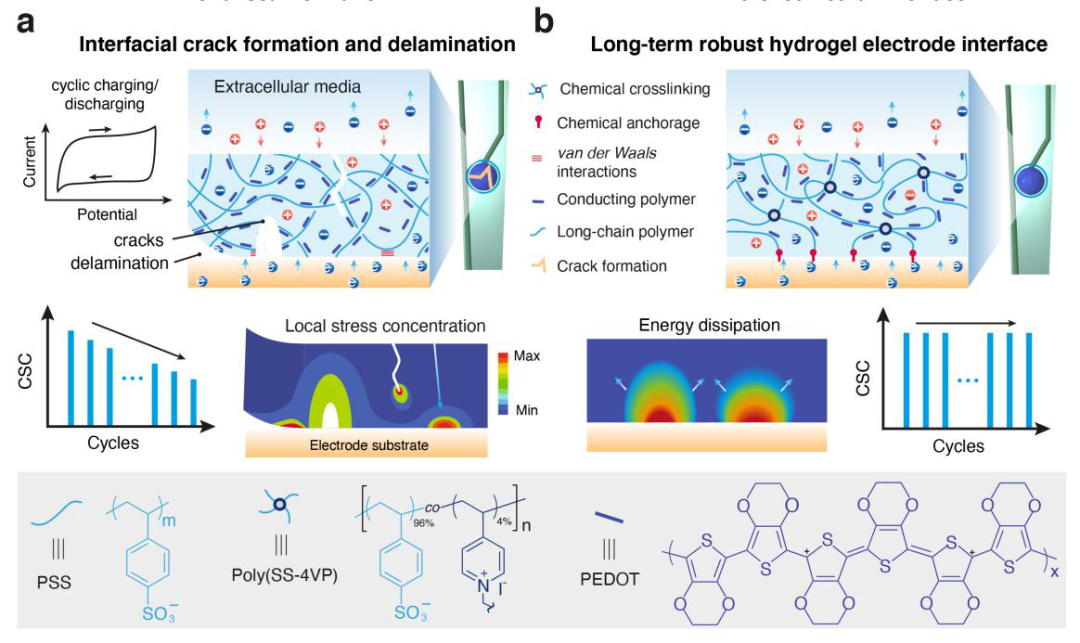 该团队通过将功能长链聚合物(聚(苯乙烯磺酸-co-4-乙烯吡啶)(Poly(SS-4VP))化学接枝到金属基底上,电化学沉积导电聚合物(如:PEDOT等)和进一步化学交联,制备出PEDOT: Poly(SS-4VP)互穿网络水凝胶(见图)。这类导电水凝胶涂层的构筑策略为高性能神经界面的构建、新一代脑机接口技术的开发,如神经类疾病的电生理记录和生物电子疗法等,提供了技术支撑。