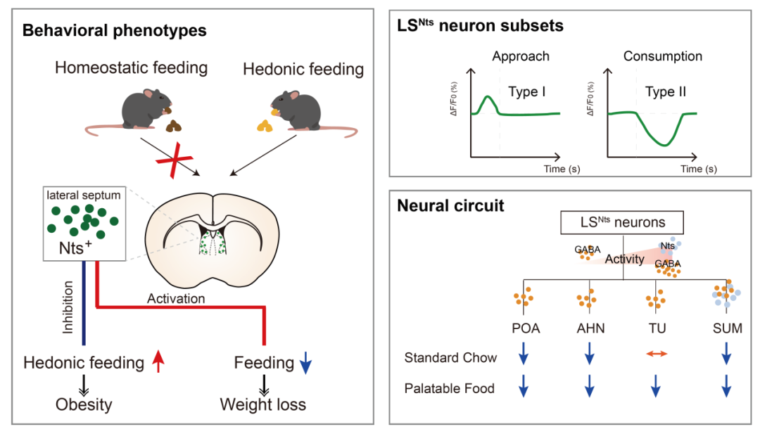2022年8月26日,朱英杰团队在Molecular Psychiatry (IF 15.9)在线发表题为A circuit from lateral septum neurotensin neurons to tuberal nucleus controls hedonic feeding 的研究论文。该研究揭示了以追求美食奖赏为动机的享乐性进食和以维持能量平衡为驱动力的稳态进食存在不同的大脑调控网络,科研团队运用基于c-fos的神经活动图谱绘制、RNA原位杂交、突触失活、光遗传学、化学遗传学、光纤钙记录和单细胞钙成像等技术,揭示了LSNts→TU神经环路对享乐性进食的特异性调控,是抑制享乐性进食、治疗肥胖和“食物成瘾”的潜在靶标。