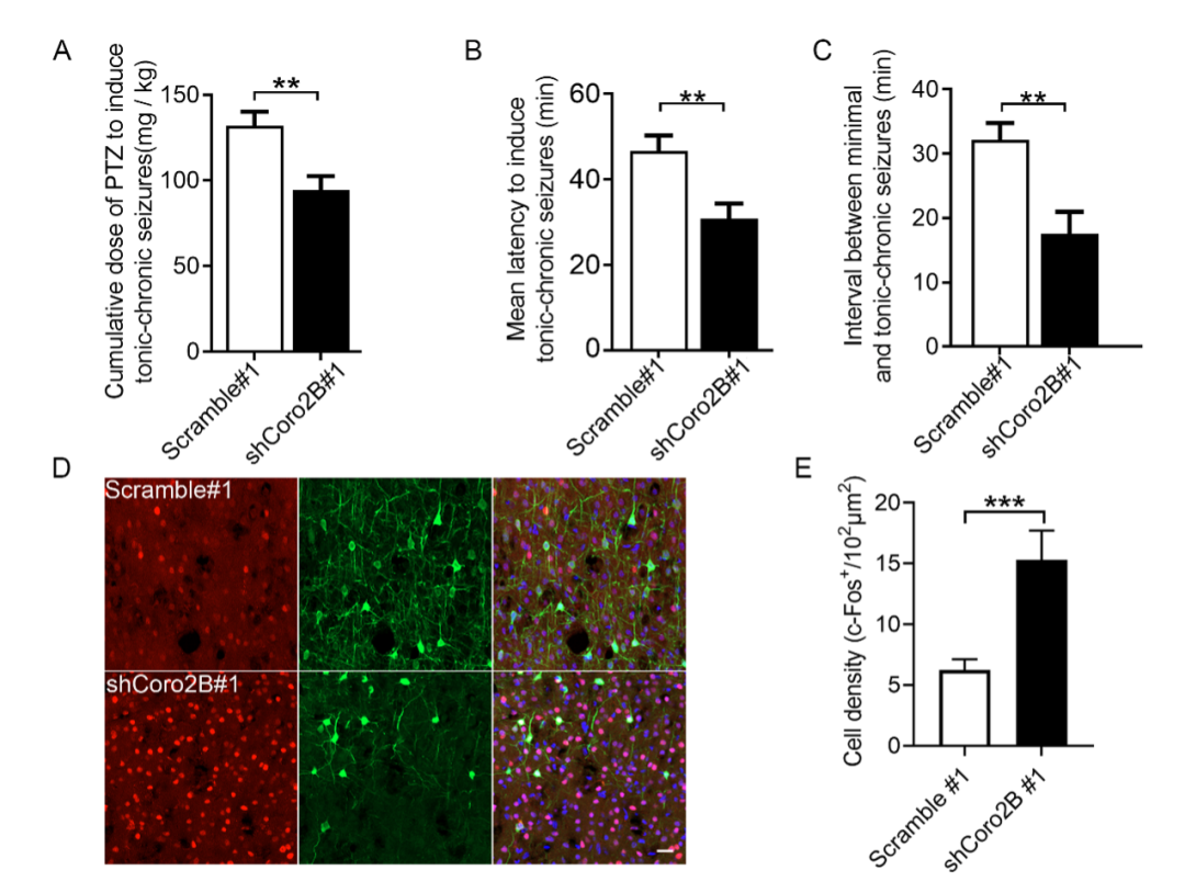 图2 | Coronin 2B敲减的小鼠更易于被药物PTZ诱导出癫痫表现