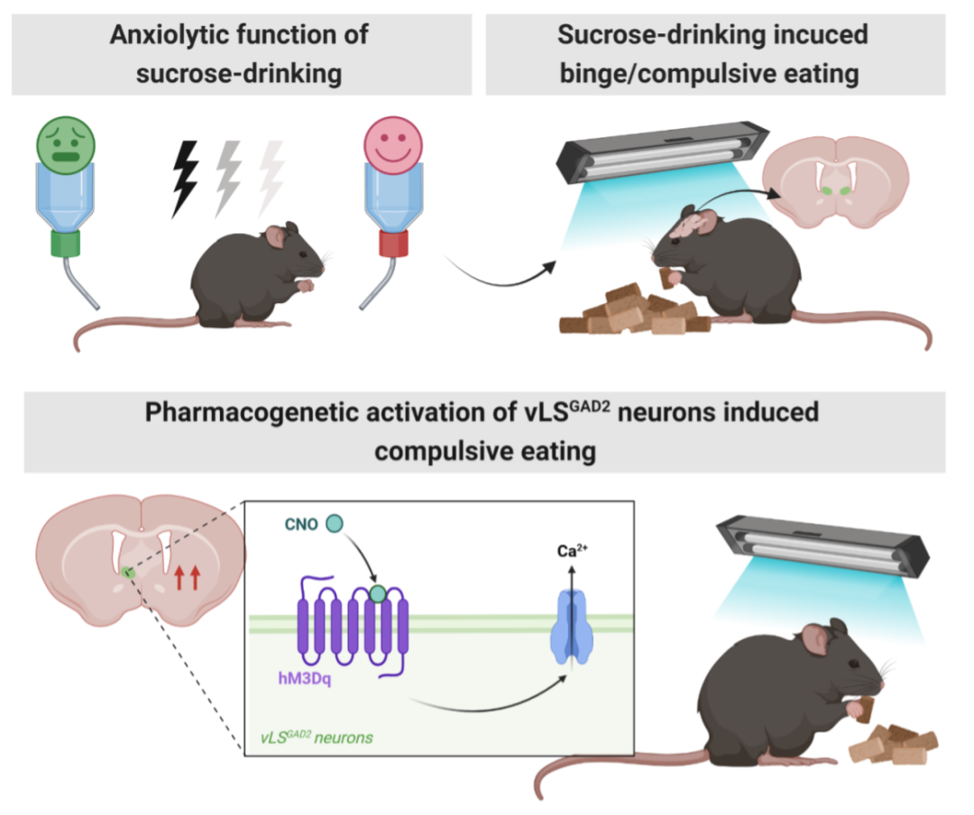 本文研究了上述问题背后的神经机制,研究人员使用双瓶蔗糖选择范式。让小鼠暴露在模拟日常生活压力的慢性不可预测的温和压力源(CUMS)中,在连续喝蔗糖的CUMS 21天后,使用高架迷宫和旷场测试来探索焦虑样行为。结果发现正常喝水的CUMS小鼠比喝蔗糖的CUMS小鼠表现出更高的焦虑水平。尽管喝蔗糖显示出抗焦虑的作用,喝蔗糖的小鼠却也表现出暴饮暴食和强迫性饮食的负性表型。该研究进一步发现,在强迫性进食后,蔗糖处理的CUMS小鼠大脑外侧隔核腹侧部(vLS)的c-Fos表达明显增加。对vLSGAD2神经元的化学遗传激活可以维持普通饲料的摄入,但当小鼠进食受到厌恶性闪光刺激时,在未接受应激的GAD2-Cre小鼠中诱发了强迫性进食的表型,模拟了慢性应激期间过度饮用蔗糖的负面后果。此外,vLSGAD2神经元的化学遗传学激活进一步加剧了应激后GAD2-Cre小鼠的焦虑水平,但没有改变未受应激小鼠的基础焦虑水平。此现象可部分解释成瘾患者高并发焦虑障碍的神经细胞机制。