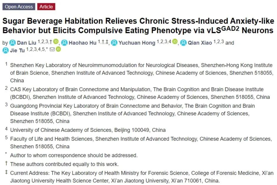 2022年12月30日,中国科学院深圳先进技术研究院(简称“深圳先进院”)脑认知与脑疾病研究所、深港脑科学创新研究院屠洁研究员课题组在国际期刊International Journal of Molecular Science上在线发表题为“Sugar beverage habitation relieves chronic stress-induced anxiety-like behavior but elicits compulsive eating phenotype via vLSGAD2 neurons”的研究论文,借助转基因动物和化学遗传学等技术,揭示了小鼠在焦虑时食欲上涨并出现暴饮暴食现象的神经生物学机制。