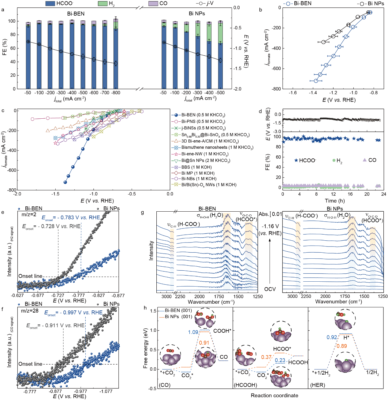 图4 | Bi-BEN与Bi纳米颗粒的二氧化碳电还原性能及机理研究。