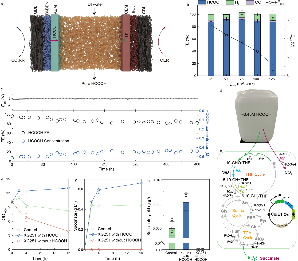 图5 | 甲酸的电化学生产及其向琥珀酸的微生物转化。