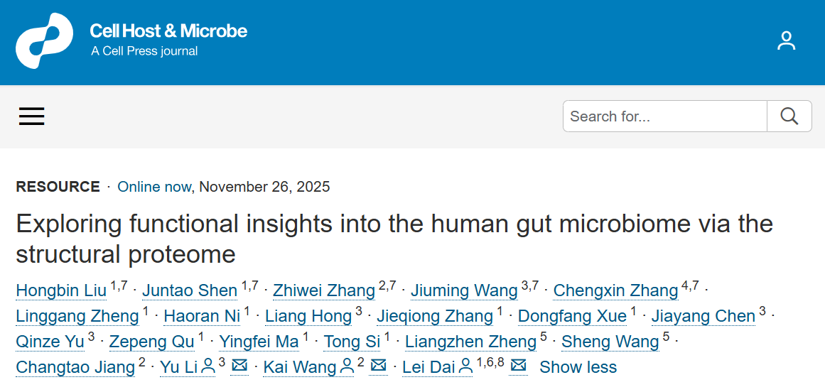 2025年11月26日,中国科学院深圳先进技术研究院定量合成生物学全国重点实验室、合成生物学研究所(以下简称“深圳先进院合成所”)戴磊研究员课题组联合北京大学汪锴研究员、香港中文大学李煜教授的合作团队在Cell Host & Microbe发表了题为“Exploring Functional Insights into the Human Gut Microbiome via the Structural Proteome”的研究论文。该研究建立了人体肠道微生物的蛋白质结构组数据库和结构检索方法,显著提高了对噬菌体蛋白、菌源宿主同工酶等功能暗物质的预测能力。基于这一方法,研究团队成功验证了肠道致病菌的噬菌体裂解酶,并首次揭示了肠道细菌的褪黑素合成途径。