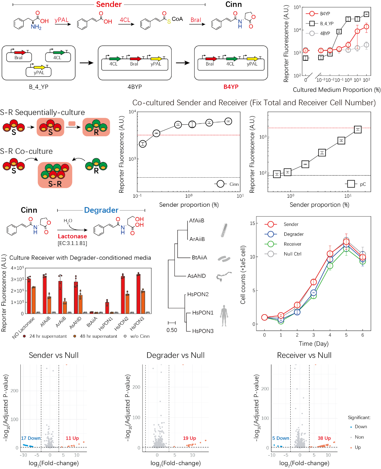在发送模块方面,本研究设计了包含三种酶的代谢通路,以细胞内广泛存在的苯丙氨酸为底物,实现了无需外源前体(Precursor-free)的Cinn自主从头合成。通过对基因表达量的优化,该模块克服了转录干扰,实现了Cinn分子的稳定高效产出。共培养实验证实,得益于系统的高灵敏度,仅需极低比例的发送细胞即可有效激活接收细胞,建立了稳健的胞间通讯。为调控信号的时空动态,系统引入了高效的内酯酶降解模块,防止信号累积导致的饱和与干扰。此外,基于细胞生长动力学与转录组学的评估表明,搭载各功能模块的工程化细胞与野生型无显著差异,证实了该系统具有卓越的底盘兼容性与低负担特性。