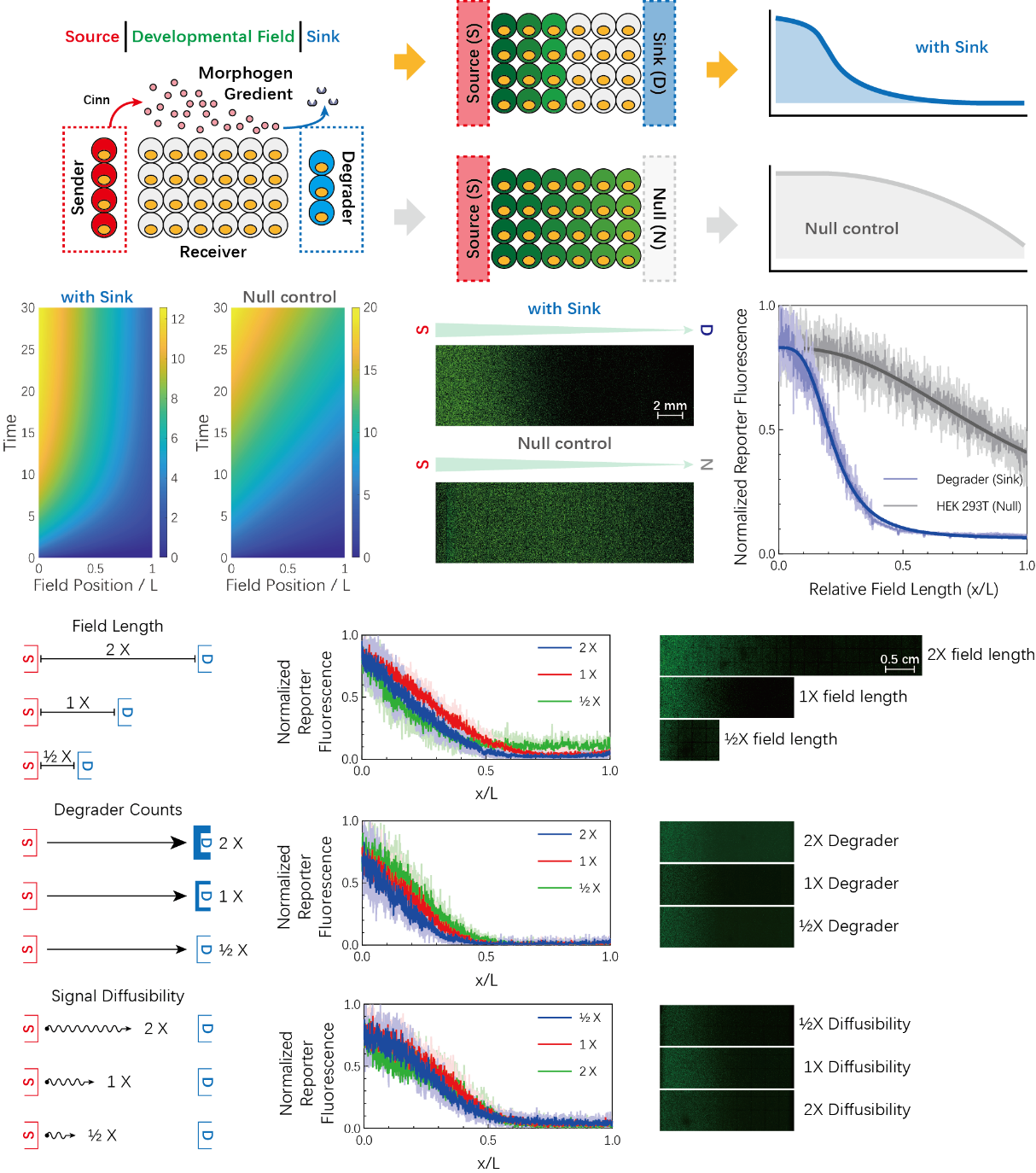 利用这套全新的工具,研究团队模拟了生物发育中的经典“源-汇(Source-Sink)”空间梯度斑图模型。他们构建了三种细胞:产生信号的“源(Sender)”细胞、降解信号的“汇(Degrader)”细胞,以及感知信号的“接收(Receiver)”细胞。实验结果令人振奋:当“源”和“汇”分别位于空间两端时,中间区域形成了一个梯度陡峭且位置稳定的信号响应梯度。