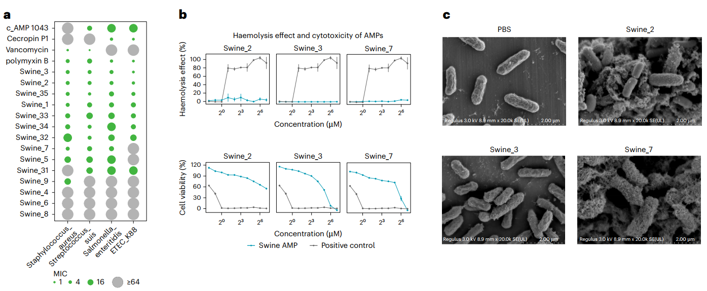研究团队对14条活性较高的AMP进行了深入评估。结果显示,其中8条(含4条远源新序列)的抗菌活性可与多粘菌素B、万古霉素等临床药物相媲美。溶血与细胞毒性实验表明,这些高活性AMP未表现出明显毒性,显示出良好的安全性(图5)。值得关注的是,抗菌肽Swine_2在小鼠腹膜炎模型中显著提高感染小鼠存活率,验证了其体内治疗潜力。