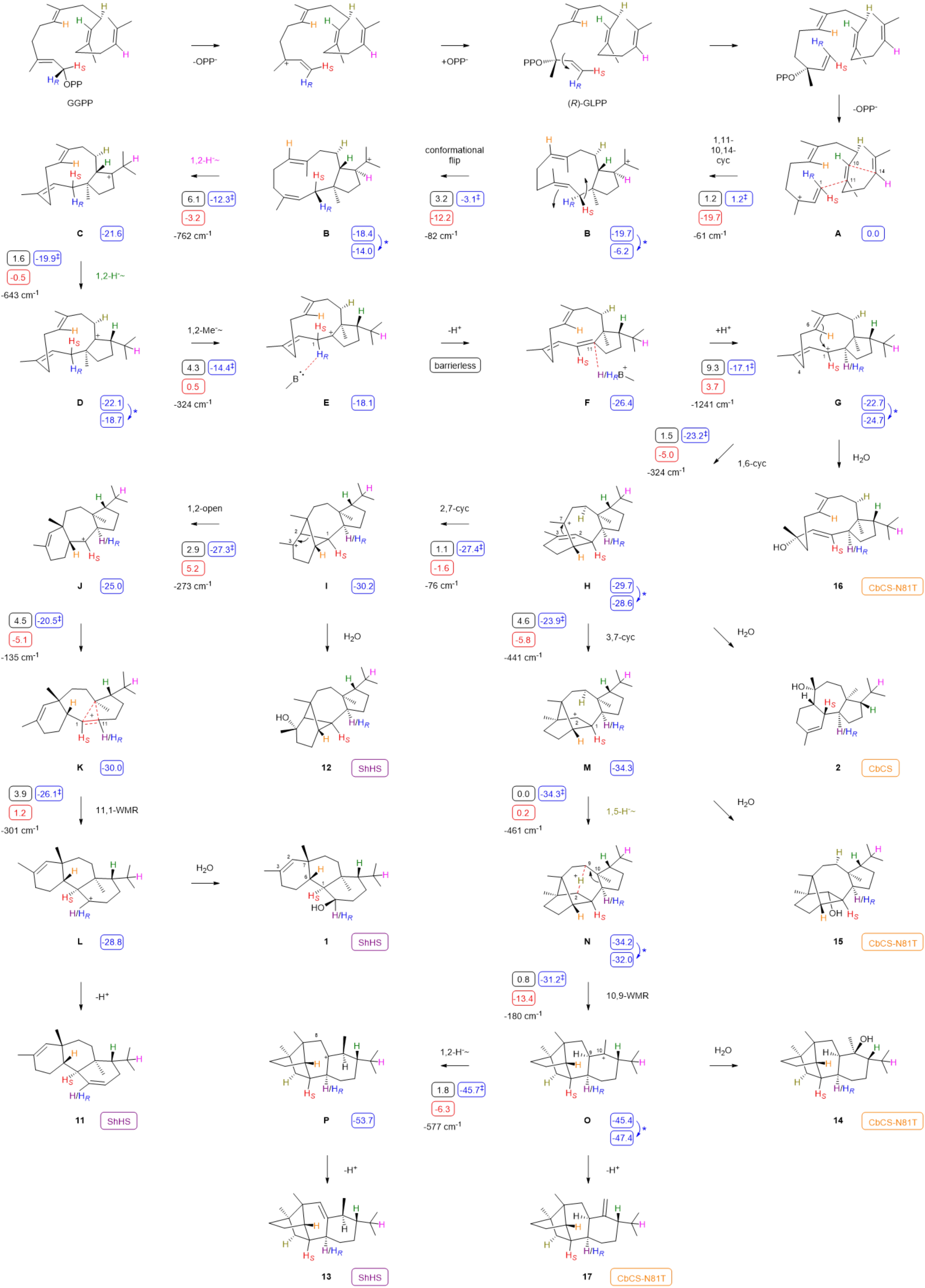 图3. ShHS和CbCS催化GGPP环化生成1、2和11-17的机制