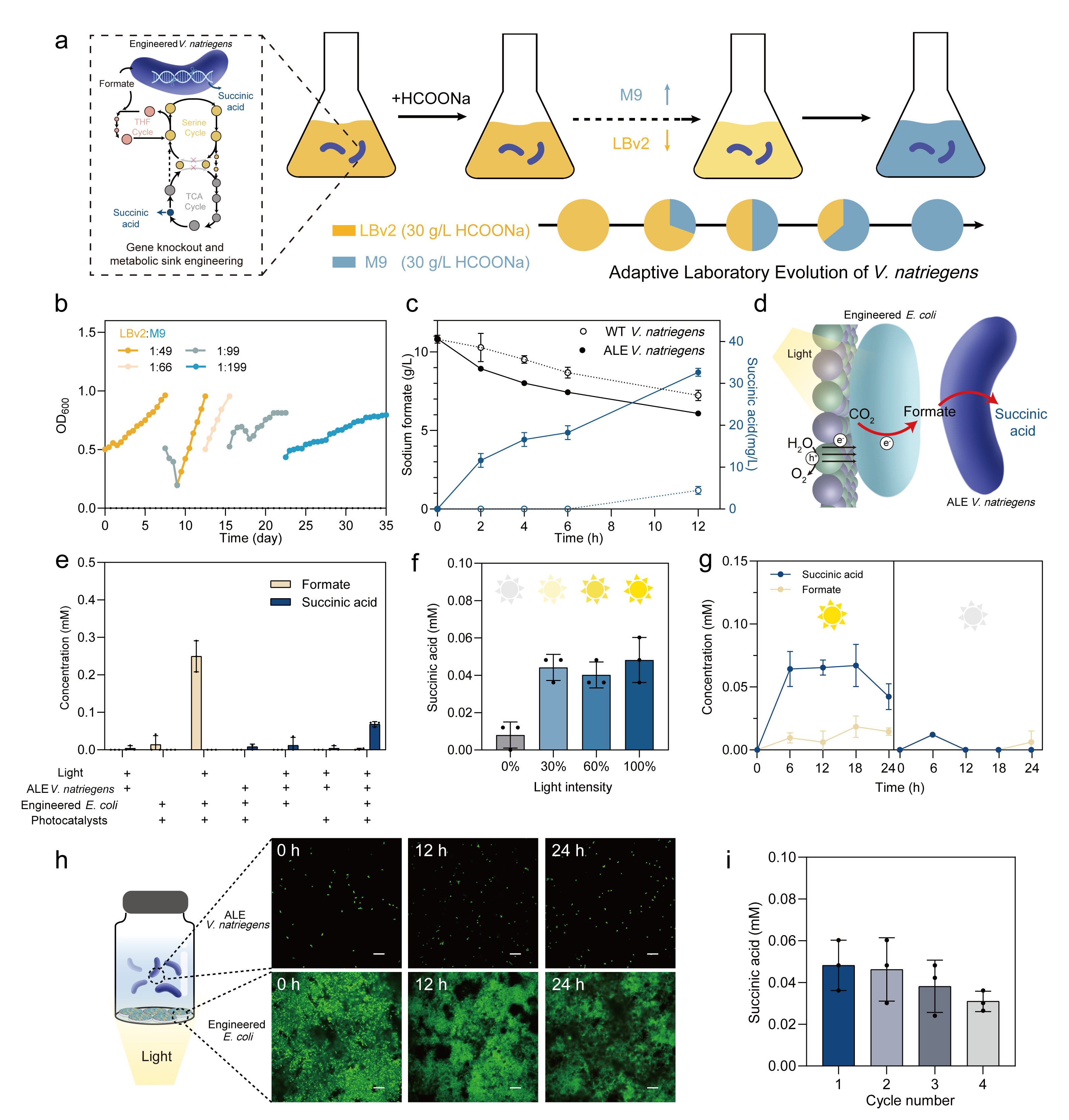 为模拟天然光合作用的长链合成能力,实现碳链延长,研究团队构建了人工微生物群落:选择需钠弧菌(Vibrio natriegens)作为底盘,通过基因敲除耦联丝氨酸循环与三羧酸循环,强化甲酸耐受能力;经5轮适应性实验室进化(adaptive laboratory evolution,ALE)后,通过四氢叶酸(THF)循环增强甲酸同化能力,使该菌株最终获得利用甲酸盐合成丁二酸的能力。适应性进化的需钠弧菌消耗甲酸的速度更快,12小时内产生了浓度为33 mg/L的琥珀酸,而野生型菌株则无法实现。