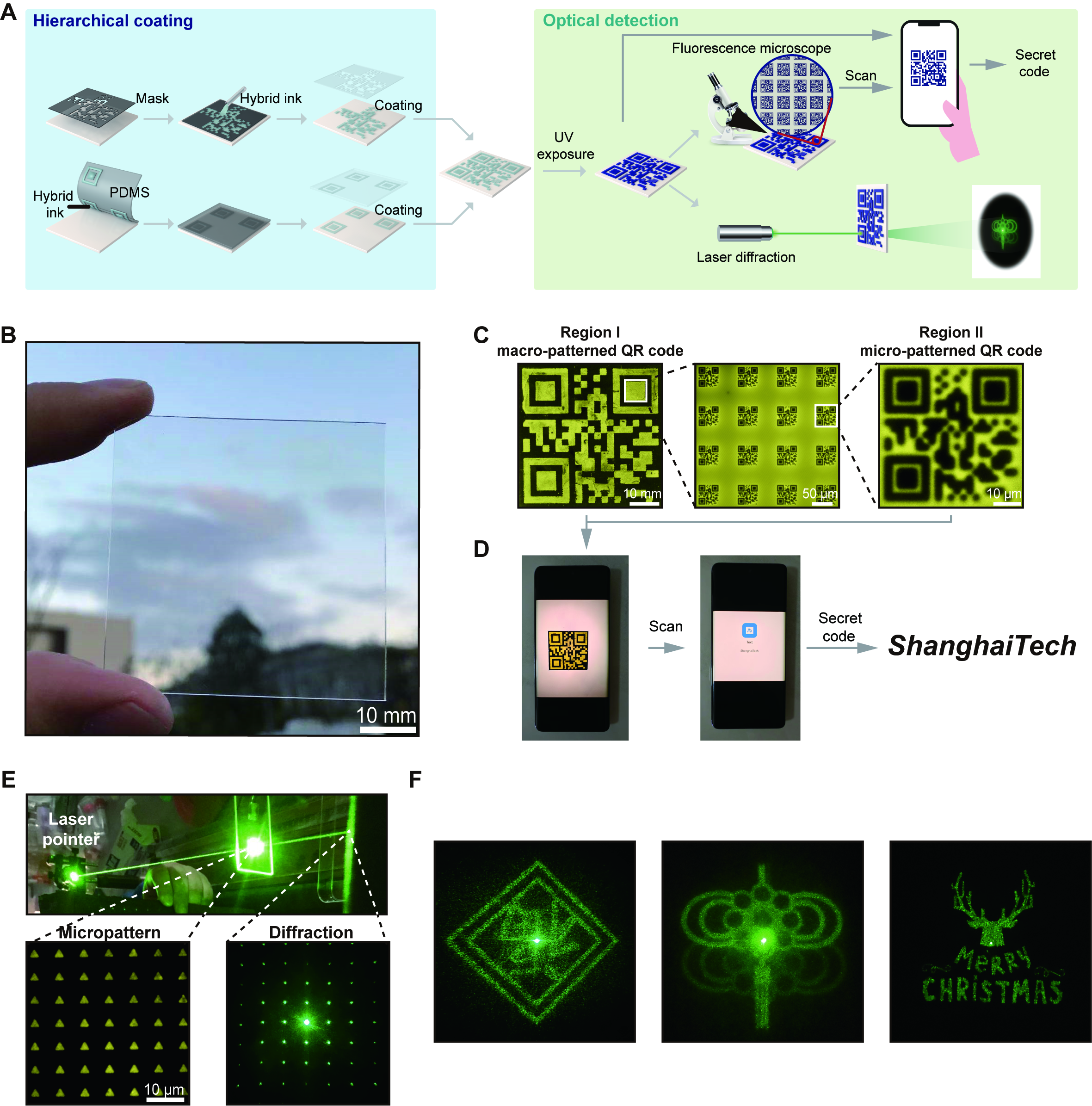 HIDE最有意思的地方,还在于它能把不同尺度的信息整合到同一套材料体系中。研究团队结合掩膜法和PDMS软刻蚀技术,在涂层中构建了宏观二维码、微观阵列图案以及可通过激光读取的衍射图样(图4)。例如,在玻璃表面制备的荧光二维码,在自然光下几乎不可见,但在特定激发条件下即可显现,并能被手机直接扫描;另一类微图案则可在激光照射下产生特定衍射图像。研究团队还进一步展示了“大二维码里嵌套小二维码”,以及“福”字、中国结、圣诞鹿等多种隐蔽图样。这种多尺度信息集成策略,相当于将不同等级的信息分层存放:外层用于快速识别,中间层用于进一步验证,最深层则需要借助分子检测手段才能真正打开。由此,HIDE 建立起一套层层递进、彼此独立又相互配合的验证体系。