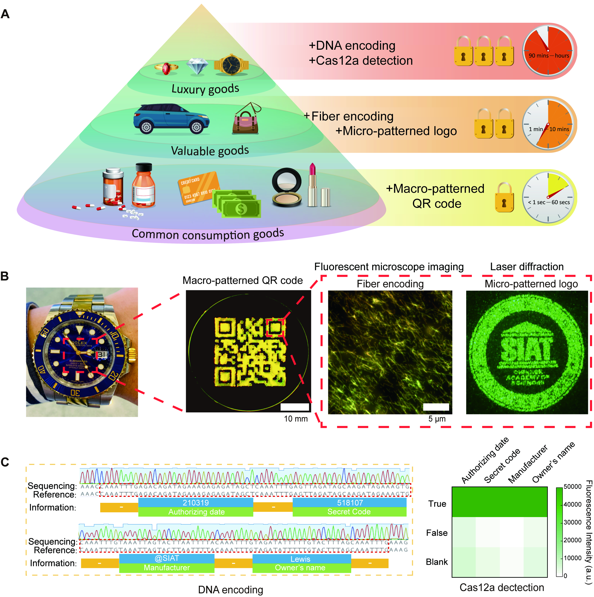 为了展示应用潜力,研究团队提出了分层次的应用场景(图5)。对于药品包装、化妆品和票据等普通消费品,第一层宏观可读的图案或二维码,就足以支持快速防伪;对于珠宝等高价值物品,可叠加显微结构和衍射图样,提高伪造门槛;而对于奢侈腕表、艺术收藏品等高端场景,则可进一步加入DNA分子编码与CRISPR检测,实现更高等级的身份认证(图5)。在示范应用中,研究团队将HIDE涂覆于腕表玻璃表面,构建了一套集四个尺度信息于一体的验证系统(图5):手机可扫出二维码,激光可读出品牌图样,显微镜可识别纳米纤维结构,而DNA检测则可进一步读取授权日期、验证码、制造方标识和所有者姓名等信息。也就是说,一块看似普通的表面,实际上拥有一套逐级开启的“身份密码”。